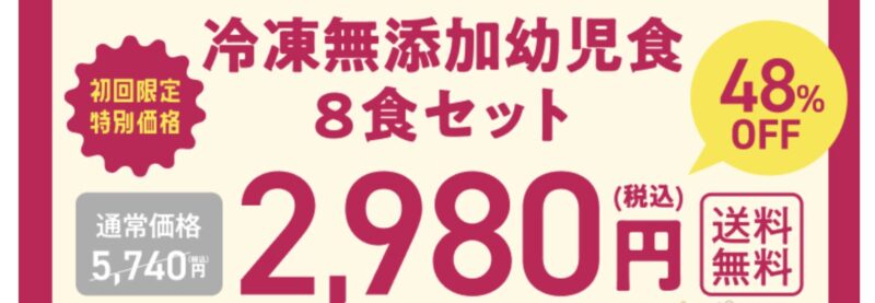 冷凍無添加幼児食8食セット (初回のみ) | 2,980円 | 372円 | 無料 | 総額6,000円OFFクーポンもらえる |