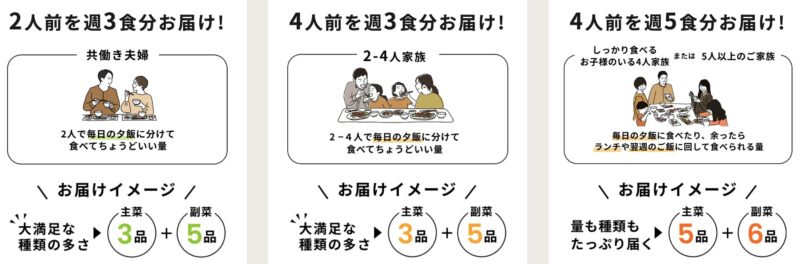 | プラン&料金 | ①2人前×週3回:7,990円(税込) ②4人前×週3回:9,990円(税込) ③4人前×週5回:15,960円(税込) |